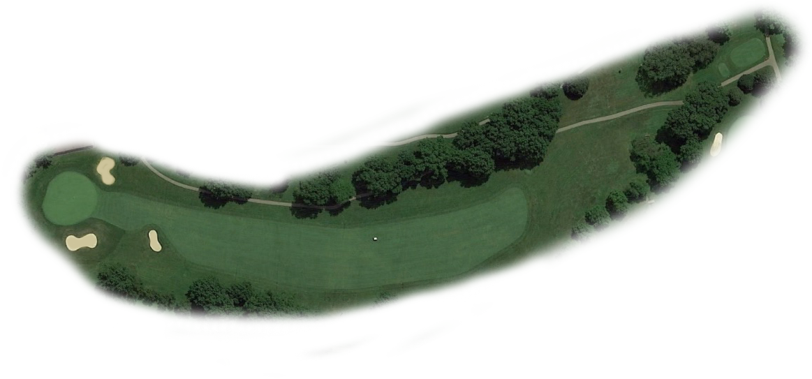 | This is by far the most challenging par 4 on the course requiring a long straight drive to miss a line of ancient oak trees that stand guard on the right hand side of the fairway. Your drive needs to favor the left hand side in order to open up the approach shot to the green with a long iron or fairway metal. While this hole boasts the largest green on the golf course it is well protected by two bunkers guarding either side. The undulating green makes it difficult to get the ball close to the hole. |